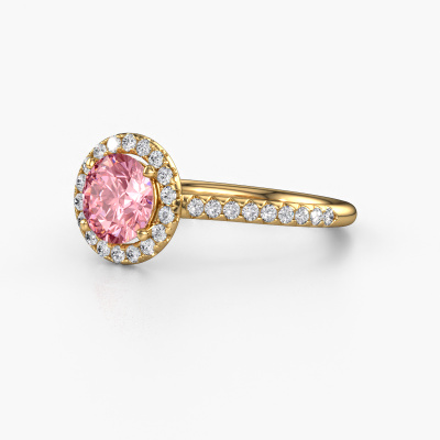 The ring shown above is called the Seline rnd 2. We call this type of ring a halo ring because it has one centre gemstone and a band that is also pave set with gemstones. The 14 Carat gold engagement ring is set with a round 6.5 mm pink lab grown diamond centre stone and the band is pave set with lab-grown diamonds. What makes this exclusive gold halo ring special are the smaller sized stones embracing the centre stone. This gorgeous engagement ring is called a halo ring because the smaller gemstones give the centre stone a halo of surrounding light. In order for the smaller stones to enhance the centre stone, they have to be placed so there is no interference of light. And that's when our expert goldsmiths come in. Each individual stone is carefully set in the ring by hand. During manufacturing, light fall is constantly monitored to make sure the special halo is still visible. In the end you get a unique engagement ring, with a pink lab grown diamond of your choosing at its centre. You can imagine the effect of a ring of such significance when you give it to her on her special day to shine. After receiving your order, our goldsmiths will start the creative process of making your Seline rnd 2 engagement ring. We don't keep stock. This is advantageous because these costs will not be passed on to you. Therefore, we can offer jewellery at exceptionally low prices.Our team adds new designs to our online collection daily. Our designers and goldsmiths work together in creating the best design. We strive to offer a diverse collection of jewels. Perhaps you have a specific jewel design in mind. One you came across somewhere. Please contact us for a free consultation. We will make you an offer, based on a fair price/ quality ratio, that will baffle you.To make it easier for you, we offer a 30 day return policy. Check our terms and conditions.