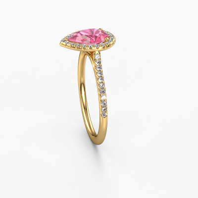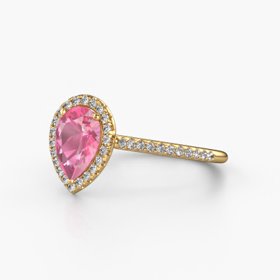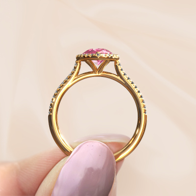 The ring shown above is called the Seline per 2. We call this type of ring a halo ring because it has one centre gemstone and a band that is also pave set with gemstones. The 14 Carat gold engagement ring is set with a pear 8x6 mm pink sapphire centre stone and the band is pave set with diamonds. What makes this classic gold halo ring special are the smaller sized stones embracing the centre stone. This gorgeous engagement ring is called a halo ring because the smaller gemstones give the centre stone a halo of surrounding light. In order for the smaller stones to enhance the centre stone, they have to be placed so there is no interference of light. And that's when our expert goldsmiths come in. Each individual stone is carefully set in the ring by hand. During manufacturing, light fall is constantly monitored to make sure the special halo is still visible. In the end you get a unique engagement ring, with a pink sapphire of your choosing at its centre. You can imagine the effect of a ring of such significance when you give it to her on her special day to shine. Because we design and deliver our own rings, we can offer you a engagement ring at a price you won't find anywhere else. A ring is made to order, which helps prevent excess supplies, so we can make you a great price offer. We understand it feels risky, buying your engagement ring online, but we will gladly assist in the designing process, taking your budget into consideration.Our designers and goldsmiths work together each day, creating new jewels. Perhaps you have found a nice classic engagement ring somewhere, which can be used to customize your unique ring. Please feel free to contact us. We will make you an offer, based on a fair price/ quality ratio, which will amaze you.To make it easier for you, we offer a 30 day return policy. Check our terms and conditions.