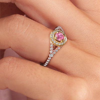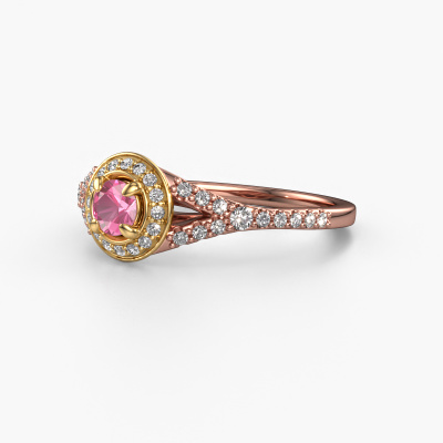 This 14 Carat rose gold ring is called Pamela RND and is set with 4 mm pink sapphire. This exclusive rose gold halo engagement ring is a true work of art! The ornaments are crafted with a lot of patience and great passion. In order to create this ring with great precision, this craft requires a keen eye and skilful hand. A challenge which ignites a fire in our expert goldsmith. The exquisite pink sapphire are set in a special way so they stand out even more. This gives the ring an even more glamorous appearance. The ajour engagement ring is actually unique on its own because of the gemstones which we carefully select especially for this ring. On top of that you select the precious metals which will be used to create a unique ring for the most extraordinary woman in your life! This jewel is unique in every way! Simply customize to your liking,Because we design and deliver our own rings, we can offer you a engagement ring at a price you won't find anywhere else. A ring is made to order, which helps prevent excess supplies, so we can make you a great price offer. We understand it feels risky, buying your engagement ring online, but we will gladly assist in the designing process, taking your budget into consideration.Our team adds new designs to our online collection daily. Our designers and goldsmiths work together in creating the best design. We strive to offer a diverse collection of jewels. Perhaps you have a specific jewel design in mind. One you came across somewhere. Please contact us for a free consultation. We will make you an offer, based on a fair price/ quality ratio, that will baffle you.To make it easier for you, we offer a 30 day return policy. Check our terms and conditions.