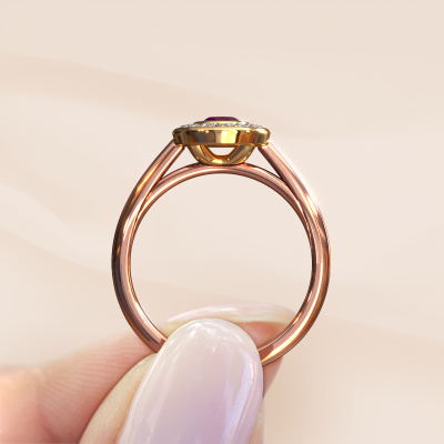 The ring shown above is called the Noud 1 OVL. We call this type of ring a halo ring because it has one centre gemstone and a band that is also pave set with gemstones. The 14 Carat rose gold engagement ring is set with a oval 6x4 mm rhodolite centre stone and the band is pave set with lab-grown diamonds. What makes this classic rose gold halo ring special are the smaller sized stones embracing the centre stone. This gorgeous engagement ring is called a halo ring because the smaller gemstones give the centre stone a halo of surrounding light. In order for the smaller stones to enhance the centre stone, they have to be placed so there is no interference of light. And that's when our expert goldsmiths come in. Each individual stone is carefully set in the ring by hand. During manufacturing, light fall is constantly monitored to make sure the special halo is still visible. In the end you get a unique engagement ring, with a rhodolite of your choosing at its centre. You can imagine the effect of a ring of such significance when you give it to her on her special day to shine. By using a combination of the latest modern techniques, combined with ancient crafting, we can make all our engagement rings in our own studio. Each jewel is made to order. This is advantageous because we can offer you a price you won't find anywhere else.Our team adds new designs to our online collection daily. Our designers and goldsmiths work together in creating the best design. We strive to offer a diverse collection of jewels. Perhaps you have a specific jewel design in mind. One you came across somewhere. Please contact us for a free consultation. We will make you an offer, based on a fair price/ quality ratio, that will baffle you.To make it easier for you, we offer a 30 day return policy. Check our terms and conditions.