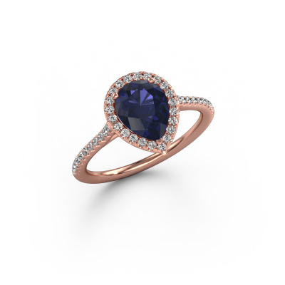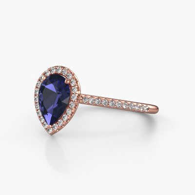 The ring shown above is called the Seline per 2. We call this type of ring a halo ring because it has one centre gemstone and a band that is also pave set with gemstones. The 14 Carat rose gold engagement ring is set with a pear 8x6 mm sapphire centre stone and the band is pave set with diamonds. What makes this classic rose gold halo ring special are the smaller sized stones embracing the centre stone. This gorgeous engagement ring is called a halo ring because the smaller gemstones give the centre stone a halo of surrounding light. In order for the smaller stones to enhance the centre stone, they have to be placed so there is no interference of light. And that's when our expert goldsmiths come in. Each individual stone is carefully set in the ring by hand. During manufacturing, light fall is constantly monitored to make sure the special halo is still visible. In the end you get a unique engagement ring, with a sapphire of your choosing at its centre. You can imagine the effect of a ring of such significance when you give it to her on her special day to shine. Because we design and deliver our own rings, we can offer you a engagement ring at a price you won't find anywhere else. A ring is made to order, which helps prevent excess supplies, so we can make you a great price offer. We understand it feels risky, buying your engagement ring online, but we will gladly assist in the designing process, taking your budget into consideration.Our designers and goldsmiths work together each day, creating new jewels. Perhaps you have found a nice classic engagement ring somewhere, which can be used to customize your unique ring. Please feel free to contact us. We will make you an offer, based on a fair price/ quality ratio, which will amaze you.To make it easier for you, we offer a 30 day return policy. Check our terms and conditions.
