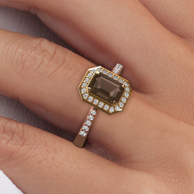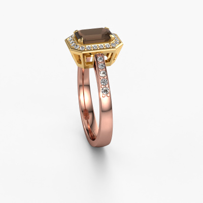 This 14 Carat rose gold ring is called Dodie 2 eme and is set with 7x5 mm smokey quartz. This exclusive rose gold halo engagement ring is a true work of art! The ornaments are crafted with a lot of patience and great passion. In order to create this ring with great precision, this craft requires a keen eye and skilful hand. A challenge which ignites a fire in our expert goldsmith. The exquisite smokey quartz are set in a special way so they stand out even more. This gives the ring an even more glamorous appearance. The pretty engagement ring is actually unique on its own because of the gemstones which we carefully select especially for this ring. On top of that you select the precious metals which will be used to create a unique ring for the most extraordinary woman in your life! This jewel is made just for you, with attention to detail and design.Because we design and deliver our own rings, we can offer you a engagement ring at a price you won't find anywhere else. A ring is made to order, which helps prevent excess supplies, so we can make you a great price offer. We understand it feels risky, buying your engagement ring online, but we will gladly assist in the designing process, taking your budget into consideration.Do you have a specific ring in mind? One you came across somewhere. Please feel free to tell us your wishes and we will turn your design into a unique engagement ring. You can follow the development of your ring design because we use 3D drawings. This gives you a realistic preview of your design. We will gladly send you a non-binding offer, based on a fair price/ quality ratio. It will amaze you.To make it easier for you, we offer a 30 day return policy. Check our terms and conditions.