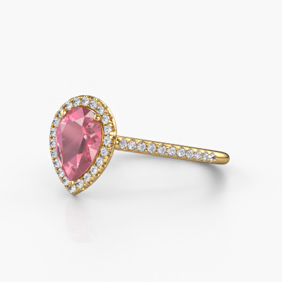 The ring shown above is called the Seline per 2. We call this type of ring a halo ring because it has one centre gemstone and a band that is also pave set with gemstones. The 14 Carat gold engagement ring is set with a pear 8x6 mm tourmaline pink centre stone and the band is pave set with diamonds. What makes this classic gold halo ring special are the smaller sized stones embracing the centre stone. This gorgeous engagement ring is called a halo ring because the smaller gemstones give the centre stone a halo of surrounding light. In order for the smaller stones to enhance the centre stone, they have to be placed so there is no interference of light. And that's when our expert goldsmiths come in. Each individual stone is carefully set in the ring by hand. During manufacturing, light fall is constantly monitored to make sure the special halo is still visible. In the end you get a unique engagement ring, with a tourmaline pink of your choosing at its centre. You can imagine the effect of a ring of such significance when you give it to her on her special day to shine. Because we design and deliver our own rings, we can offer you a engagement ring at a price you won't find anywhere else. A ring is made to order, which helps prevent excess supplies, so we can make you a great price offer. We understand it feels risky, buying your engagement ring online, but we will gladly assist in the designing process, taking your budget into consideration.Our designers and goldsmiths work together each day, creating new jewels. Perhaps you have found a nice classic engagement ring somewhere, which can be used to customize your unique ring. Please feel free to contact us. We will make you an offer, based on a fair price/ quality ratio, which will amaze you.To make it easier for you, we offer a 30 day return policy. Check our terms and conditions.