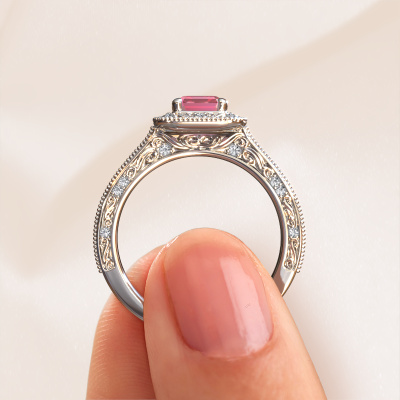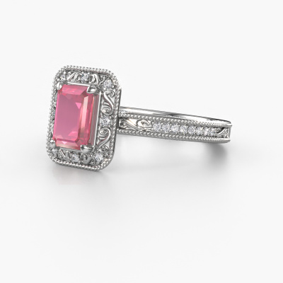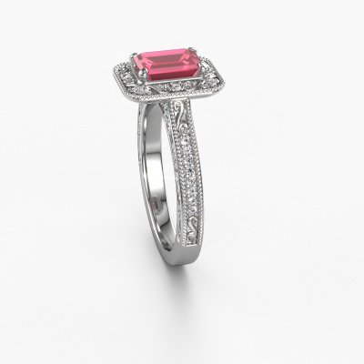 This platinum ring is called Alice EME and is set with 7x5 mm tourmaline pink. An extraordinary platinum vintage ring. One that will surely make the love of your life shine like a diamond! That is what we hope to achieve. This vintage Engagement ring is set with exquisite tourmaline pink. Whichever gemstone you choose from our selection, is up to you. The gemstone is selected with great care because we believe your pearl edges Engagement ring must be adorned with nothing but the most beautiful gemstone. Wouldn't you agree? Our expert goldsmith will design your ring in our own crafting studio, where the tourmaline pink will be set with great precision. The ring will then be polished till it shines perfectly. Nothing but the best for the love of your life! This jewel is made just for you by our master goldsmiths in our own studio.By using a combination of the latest modern techniques, combined with ancient crafting, we can make all our Engagement rings in our own studio. Each jewel is made to order. This is advantageous because we can offer you a price you won't find anywhere else.Do you have a specific ring in mind? One you came across somewhere. Please feel free to tell us your wishes and we will turn your design into a unique Engagement ring. You can follow the development of your ring design because we use 3D drawings. This gives you a realistic preview of your design. We will gladly send you a non-binding offer, based on a fair price/ quality ratio. It will amaze you.To make it easier for you, we offer a 30 day return policy. Check our terms and conditions.