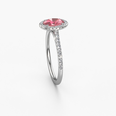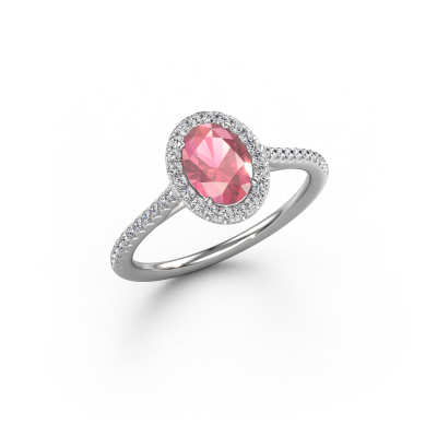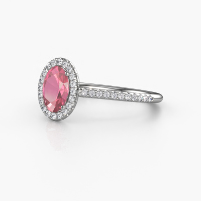 The ring shown above is called the Seline ovl 2. We call this type of ring a halo ring because it has one centre gemstone and a band that is also pave set with gemstones. The 14 Carat white gold engagement ring is set with a oval 7x5 mm tourmaline pink centre stone and the band is pave set with diamonds. What makes this exclusive white gold halo ring special are the smaller sized stones embracing the centre stone. This gorgeous engagement ring is called a halo ring because the smaller gemstones give the centre stone a halo of surrounding light. In order for the smaller stones to enhance the centre stone, they have to be placed so there is no interference of light. And that's when our expert goldsmiths come in. Each individual stone is carefully set in the ring by hand. During manufacturing, light fall is constantly monitored to make sure the special halo is still visible. In the end you get a unique engagement ring, with a tourmaline pink of your choosing at its centre. You can imagine the effect of a ring of such significance when you give it to her on her special day to shine. After receiving your order, our goldsmiths will start the creative process of making your Seline ovl 2 engagement ring. We don't keep stock. This is advantageous because these costs will not be passed on to you. Therefore, we can offer jewellery at exceptionally low prices.Our team adds new designs to our online collection daily. Our designers and goldsmiths work together in creating the best design. We strive to offer a diverse collection of jewels. Perhaps you have a specific jewel design in mind. One you came across somewhere. Please contact us for a free consultation. We will make you an offer, based on a fair price/ quality ratio, that will baffle you.To make it easier for you, we offer a 30 day return policy. Check our terms and conditions.