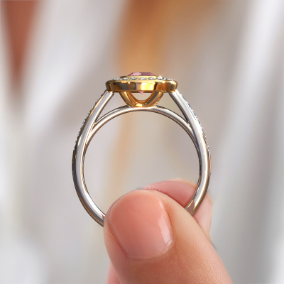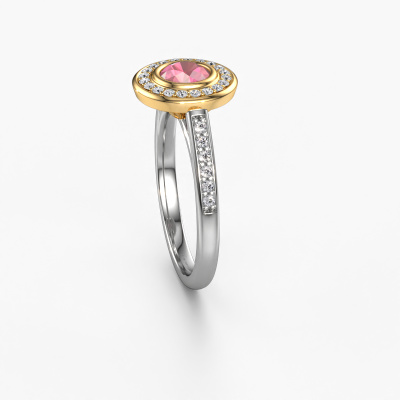 The ring shown above is called the Noud 2 RND. We call this type of ring a halo ring because it has one centre gemstone and a band that is also pave set with gemstones. The 14 Carat white gold engagement ring is set with a round 5 mm tourmaline pink centre stone and the band is pave set with diamonds. What makes this luxury white gold halo ring special are the smaller sized stones embracing the centre stone. This gorgeous engagement ring is called a halo ring because the smaller gemstones give the centre stone a halo of surrounding light. In order for the smaller stones to enhance the centre stone, they have to be placed so there is no interference of light. And that's when our expert goldsmiths come in. Each individual stone is carefully set in the ring by hand. During manufacturing, light fall is constantly monitored to make sure the special halo is still visible. In the end you get a unique engagement ring, with a tourmaline pink of your choosing at its centre. You can imagine the effect of a ring of such significance when you give it to her on her special day to shine. By using a combination of the latest modern techniques, combined with ancient crafting, we can make all our engagement rings in our own studio. Each jewel is made to order. This is advantageous because we can offer you a price you won't find anywhere else.Have you found a specific engagement ring somewhere which you would like to give to your loved one? Please feel free to express your wishes to our jewel designers because we would be honoured to turn your design into a luxury engagement ring. You can follow the development of your ring design because we use 3D drawings. This gives you a realistic preview of how your design will look. You can also preorder a dummy. A dummy is a plastic ring, which can be shaped according your ring design. You can try it on and check if its width and size are suitable for you. We will gladly send you a non-binding offer, based on a fair price/ quality ratio. It will amaze you, considering the quality of the ring and gemstones.To make it easier for you, we offer a 30 day return policy. Check our terms and conditions.