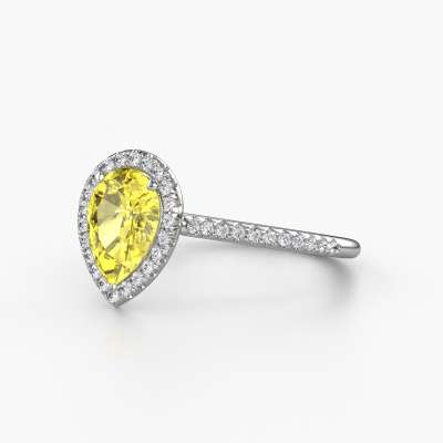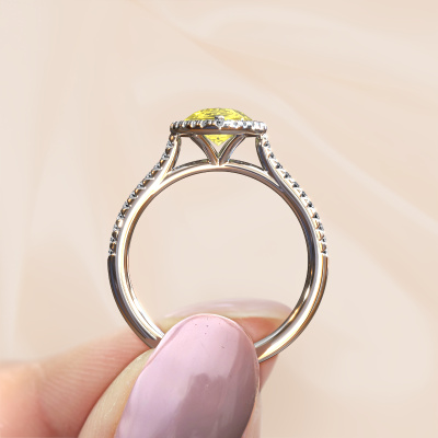 The ring shown above is called the Seline per 2. We call this type of ring a halo ring because it has one centre gemstone and a band that is also pave set with gemstones. The platinum engagement ring is set with a pear 8x6 mm yellow lab grown diamond centre stone and the band is pave set with diamonds. What makes this classic platinum halo ring special are the smaller sized stones embracing the centre stone. This gorgeous engagement ring is called a halo ring because the smaller gemstones give the centre stone a halo of surrounding light. In order for the smaller stones to enhance the centre stone, they have to be placed so there is no interference of light. And that's when our expert goldsmiths come in. Each individual stone is carefully set in the ring by hand. During manufacturing, light fall is constantly monitored to make sure the special halo is still visible. In the end you get a unique engagement ring, with a yellow lab grown diamond of your choosing at its centre. You can imagine the effect of a ring of such significance when you give it to her on her special day to shine. Because we design and deliver our own rings, we can offer you a engagement ring at a price you won't find anywhere else. A ring is made to order, which helps prevent excess supplies, so we can make you a great price offer. We understand it feels risky, buying your engagement ring online, but we will gladly assist in the designing process, taking your budget into consideration.Our designers and goldsmiths work together each day, creating new jewels. Perhaps you have found a nice classic engagement ring somewhere, which can be used to customize your unique ring. Please feel free to contact us. We will make you an offer, based on a fair price/ quality ratio, which will amaze you.To make it easier for you, we offer a 30 day return policy. Check our terms and conditions.