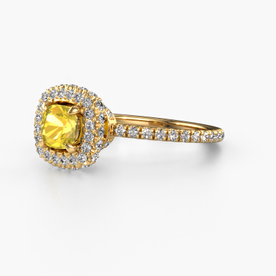 The ring shown above is called the Talitha CUS. We call this type of ring a halo ring because it has one centre gemstone and a band that is also pave set with gemstones. The 14 Carat gold engagement ring is set with a cushion 5 mm yellow sapphire centre stone and the band is pave set with diamonds. What makes this traditional gold halo ring special are the smaller sized stones embracing the centre stone. This gorgeous engagement ring is called a halo ring because the smaller gemstones give the centre stone a halo of surrounding light. In order for the smaller stones to enhance the centre stone, they have to be placed so there is no interference of light. And that's when our expert goldsmiths come in. Each individual stone is carefully set in the ring by hand. During manufacturing, light fall is constantly monitored to make sure the special halo is still visible. In the end you get a unique engagement ring, with a yellow sapphire of your choosing at its centre. You can imagine the effect of a ring of such significance when you give it to her on her special day to shine. Because we design and deliver our own rings, we can offer you a engagement ring at a price you won't find anywhere else. A ring is made to order, which helps prevent excess supplies, so we can make you a great price offer. We understand it feels risky, buying your engagement ring online, but we will gladly assist in the designing process, taking your budget into consideration.Our designers and goldsmiths work together each day, creating new jewels. Perhaps you have found a nice traditional engagement ring somewhere, which can be used to customize your unique ring. Please feel free to contact us. We will make you an offer, based on a fair price/ quality ratio, which will amaze you.To make it easier for you, we offer a 30 day return policy. Check our terms and conditions.