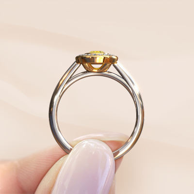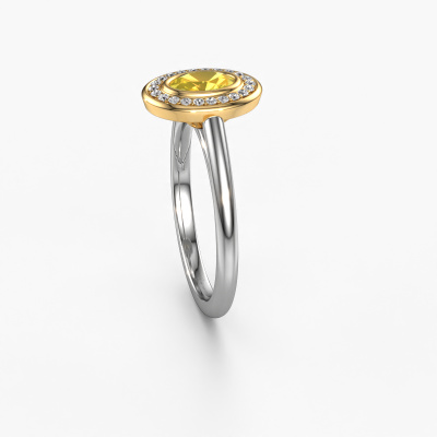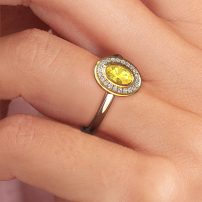 The ring shown above is called the Noud 1 OVL. We call this type of ring a halo ring because it has one centre gemstone and a band that is also pave set with gemstones. The 14 Carat white gold engagement ring is set with a oval 6x4 mm yellow sapphire centre stone and the band is pave set with lab-grown diamonds. What makes this classic white gold halo ring special are the smaller sized stones embracing the centre stone. This gorgeous engagement ring is called a halo ring because the smaller gemstones give the centre stone a halo of surrounding light. In order for the smaller stones to enhance the centre stone, they have to be placed so there is no interference of light. And that's when our expert goldsmiths come in. Each individual stone is carefully set in the ring by hand. During manufacturing, light fall is constantly monitored to make sure the special halo is still visible. In the end you get a unique engagement ring, with a yellow sapphire of your choosing at its centre. You can imagine the effect of a ring of such significance when you give it to her on her special day to shine. By using a combination of the latest modern techniques, combined with ancient crafting, we can make all our engagement rings in our own studio. Each jewel is made to order. This is advantageous because we can offer you a price you won't find anywhere else.Our team adds new designs to our online collection daily. Our designers and goldsmiths work together in creating the best design. We strive to offer a diverse collection of jewels. Perhaps you have a specific jewel design in mind. One you came across somewhere. Please contact us for a free consultation. We will make you an offer, based on a fair price/ quality ratio, that will baffle you.To make it easier for you, we offer a 30 day return policy. Check our terms and conditions.