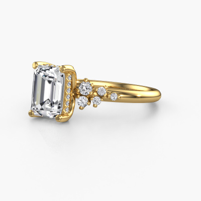 The ring shown above is called the Emma EME. We call this type of ring a pavé solitaire ring because it has one centre gemstone and a band that is also pave set with gemstones. This engagement ring is made in 14 Carat gold set with a 1.75 crt emerald cut lab grown diamond, and pave set lab-grown diamonds at the sides. Each piece of jewellery is made with passion and love by one of our master goldsmiths.This fantasy gold pavé solitaire engagement ring has an exquisite emerald cut lab grown diamond centre stone. To further accentuate the centre stone, the band is set full with more lab-grown diamonds. Its open prong setting allows light to strike the lab grown diamond from various angles and this adds sparkle to your lab grown diamond ring. The photo shown above depicts the goldsmith's carefully handcrafted details of the ring. The high positioning of the centre stone is truly eye-catching. The perfect engagement ring for the crown jewel of your life!After receiving your order, our goldsmiths will passionately start the creative process of making your engagement ring in our own studio. Because we don't have a big stockpile, these costs will not be passed on to you. Our pricing is proof of that! We offer top quality jewels at lowest price, guaranteed.Our team adds new designs to our online collection daily. Our designers and goldsmiths work together in creating the best design. We strive to offer a diverse collection of jewels. Perhaps you have a specific jewel design in mind. One you came across somewhere. Please contact us for a free consultation. We will make you an offer, based on a fair price/ quality ratio, that will baffle you.To make it easier for you, we offer a 30 day return policy. Check our terms and conditions.