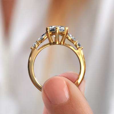 The ring shown above is called the Megan MRQ. We call this type of ring a pavé solitaire ring because it has one centre gemstone and a band that is also pave set with gemstones. This engagement ring is made in 14 Carat gold set with a 3.00 crt marquise lab grown diamond, and pave set lab-grown diamonds at the sides. Each piece of jewellery is made with passion and love by one of our master goldsmiths.This fantasy gold pavé solitaire engagement ring has an exquisite marquise lab grown diamond centre stone. To further accentuate the centre stone, the band is set full with more lab-grown diamonds. Its open prong setting allows light to strike the lab grown diamond from various angles and this adds sparkle to your lab grown diamond ring. The photo shown above depicts the goldsmith's carefully handcrafted details of the ring. The high positioning of the centre stone is truly eye-catching. The perfect engagement ring for the crown jewel of your life![bestp1v_long]Have you found a specific engagement ring somewhere which you would like to give to your loved one? Please feel free to express your wishes to our jewel designers because we would be honoured to turn your design into a fantasy engagement ring. You can follow the development of your ring design because we use 3D drawings. This gives you a realistic preview of how your design will look. You can also preorder a dummy. A dummy is a plastic ring, which can be shaped according your ring design. You can try it on and check if its width and size are suitable for you. We will gladly send you a non-binding offer, based on a fair price/ quality ratio. It will amaze you, considering the quality of the ring and gemstones.To make it easier for you, we offer a 30 day return policy. Check our terms and conditions.