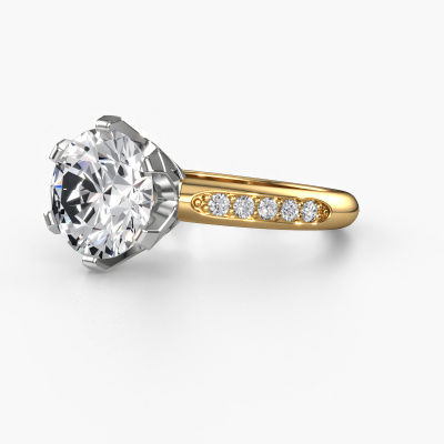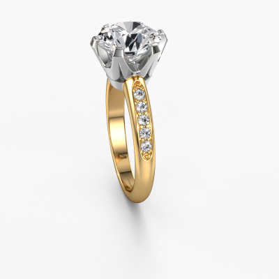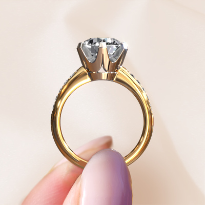 The ring shown above is called the Tiffy 2. We call this type of ring a pavé solitaire ring because it has one centre gemstone and a band that is also pave set with gemstones. This engagement ring is made in 14 Carat gold set with a 3.00 crt round lab grown diamond, and pave set diamonds at the sides. Each piece of jewellery is created to add sparkle to your finger, each jewel is lovingly made by hand by our goldsmiths.This traditional gold pavé solitaire engagement ring has an exquisite round lab grown diamond centre stone. To further accentuate the centre stone, the band is set full with more diamonds. Its open prong setting allows light to strike the lab grown diamond from various angles and this adds sparkle to your lab grown diamond ring. The photo shown above depicts the goldsmith's carefully handcrafted details of the ring. The high positioning of the centre stone is truly eye-catching. The perfect engagement ring for the crown jewel of your life!By using our modern techniques, we can design and customize the finest quality jewels with the utmost care for you. Our engagement rings are always priced 30 percent lower than other jewellers. We make engagement rings to order so we don't have to maintain a large stock. If you have a certain budget, we are more than happy to advice you accordingly.Our designers and goldsmiths work together each day, creating new jewels. Perhaps you have found a nice traditional engagement ring somewhere, which can be used to customize your unique ring. Please feel free to contact us. We will make you an offer, based on a fair price/ quality ratio, which will amaze you.To make it easier for you, we offer a 30 day return policy. Check our terms and conditions.