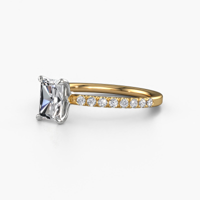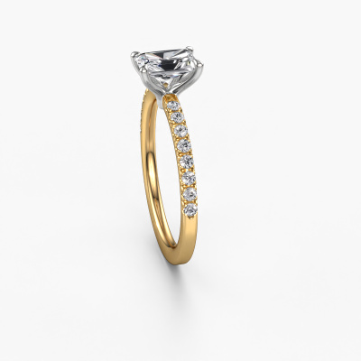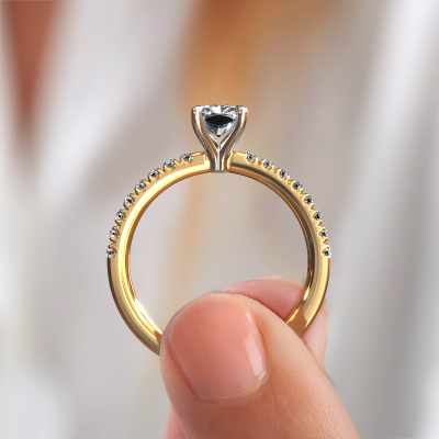 The ring shown above is called the Crystal RAD 2. We call this type of ring a pavé solitaire ring because it has one centre gemstone and a band that is also pave set with gemstones. The 14 Carat gold engagement ring is set with a radiant 0.75 crt lab grown diamond centre stone and the band is pave set with lab grown diamond gemstones. Each jewel is made to shine bright around your finger. Each jewel is hand made with love by our goldsmiths.This luxury gold pavé solitaire engagement ring has an exquisite radiant lab grown diamond centre stone. To further accentuate the centre stone, the band is fully set with more lab-grown diamonds. Its open prong setting allows light to strike the lab grown diamond from various angles and this adds sparkle to your lab grown diamond ring. The photo shown above depicts the goldsmith's carefully handcrafted details of the ring. The high positioning of the centre stone is truly eye-catching. The perfect engagement ring for the crown jewel of your life! By using a combination of the latest modern techniques, combined with ancient crafting, we can make all our engagement rings in our own studio. Each jewel is made to order. This is advantageous because we can offer you a price you won't find anywhere else.Our designers and goldsmiths work together each day, creating new jewels. Perhaps you have found a nice luxury engagement ring somewhere, which can be used to customize your unique ring. Please feel free to contact us. We will make you an offer, based on a fair price/ quality ratio, which will amaze you.To make it easier for you, we offer a 30 day return policy. Check our terms and conditions.