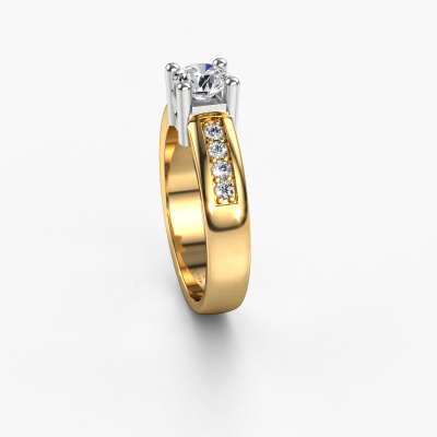 The ring shown above is called the Eline 2. We call this type of ring a pavé solitaire ring because it has one centre gemstone and a band that is also pave set with gemstones. The 14 Carat gold engagement ring is set with a round 0.70 crt lab grown diamond centre stone and the band is pave set with diamond gemstones. Each jewel is unique in every way! Simply customize to your liking,This modern gold pavé solitaire engagement ring has an exquisite round lab grown diamond centre stone. To further accentuate the centre stone, the band is fully set with more diamonds. Its open prong setting allows light to strike the lab grown diamond from various angles and this adds sparkle to your lab grown diamond ring. The photo shown above depicts the goldsmith's carefully handcrafted details of the ring. The high positioning of the centre stone is truly eye-catching. The perfect engagement ring for the crown jewel of your life! Because we design and deliver our own rings, we can offer you a engagement ring at a price you won't find anywhere else. A ring is made to order, which helps prevent excess supplies, so we can make you a great price offer. We understand it feels risky, buying your engagement ring online, but we will gladly assist in the designing process, taking your budget into consideration.Our team adds new designs to our online collection daily. Our designers and goldsmiths work together in creating the best design. We strive to offer a diverse collection of jewels. Perhaps you have a specific jewel design in mind. One you came across somewhere. Please contact us for a free consultation. We will make you an offer, based on a fair price/ quality ratio, that will baffle you.To make it easier for you, we offer a 30 day return policy. Check our terms and conditions.