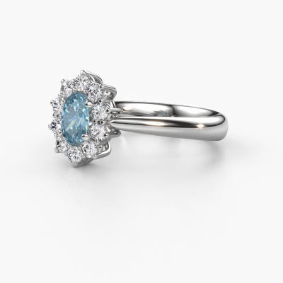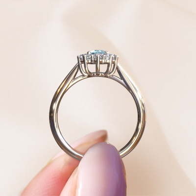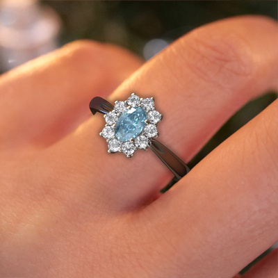 The ring shown above is called the Leesa 1. We call this type of ring a Lady Diana ring. The centre gemstone is surrounded by smaller sized stones. This 14 Carat white gold version is set with a 6x4 mm oval blue lab grown diamond centre stone, embraced by smaller diamonds. What makes this classic white gold Lady Diana ring special is the setting of the smaller gems surrounding the centre blue lab grown diamond, which are shaped like a beautiful flower. The surrounding Lady Diana of stones frame the middle centre stone in such a way to make it appear bigger. This type of engagement ring is also called a flower ring. It is very important that the smaller diamonds are positioned identically so there is no interference of light but perfect unity instead. Our skilled Goldsmiths get the job done. Each individual stone is carefully set by hand. During manufacturing, light fall is constantly monitored to make sure the special Lady Diana effect is still visible. In the end you get the perfect engagement ring with a radiant blue lab grown diamond gemstone centrepiece. You can imagine the effect of a ring of such significance when you give tot the love of your life on her special day to shine. This jewel is made to shine bright around your finger. Each jewel is hand made with love by our goldsmiths.After receiving your order, our goldsmiths will start the creative process of making your Leesa 1 engagement ring. We don't keep stock. This is advantageous because these costs will not be passed on to you. Therefore, we can offer jewellery at exceptionally low prices.Have you found a specific engagement ring somewhere which you would like to give to your loved one? Please feel free to express your wishes to our jewel designers because we would be honoured to turn your design into a classic engagement ring. You can follow the development of your ring design because we use 3D drawings. This gives you a realistic preview of how your design will look. You can also preorder a dummy. A dummy is a plastic ring, which can be shaped according your ring design. You can try it on and check if its width and size are suitable for you. We will gladly send you a non-binding offer, based on a fair price/ quality ratio. It will amaze you, considering the quality of the ring and gemstones.To make it easier for you, we offer a 30 day return policy. Check our terms and conditions.