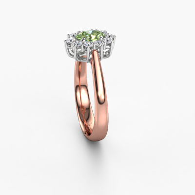 The ring shown above is called the Leesa 1. We call this type of ring a Lady Diana ring. The centre gemstone is surrounded by smaller sized stones. This 14 Carat rose gold version is set with a 6x4 mm oval green lab grown diamond centre stone, embraced by smaller diamonds. What makes this classic rose gold Lady Diana ring special is the setting of the smaller gems surrounding the centre green lab grown diamond, which are shaped like a beautiful flower. The surrounding Lady Diana of stones frame the middle centre stone in such a way to make it appear bigger. This type of engagement ring is also called a flower ring. It is very important that the smaller diamonds are positioned identically so there is no interference of light but perfect unity instead. Our skilled Goldsmiths get the job done. Each individual stone is carefully set by hand. During manufacturing, light fall is constantly monitored to make sure the special Lady Diana effect is still visible. In the end you get the perfect engagement ring with a radiant green lab grown diamond gemstone centrepiece. You can imagine the effect of a ring of such significance when you give tot the love of your life on her special day to shine. This jewel is made to shine bright around your finger. Each jewel is hand made with love by our goldsmiths.After receiving your order, our goldsmiths will start the creative process of making your Leesa 1 engagement ring. We don't keep stock. This is advantageous because these costs will not be passed on to you. Therefore, we can offer jewellery at exceptionally low prices.Have you found a specific engagement ring somewhere which you would like to give to your loved one? Please feel free to express your wishes to our jewel designers because we would be honoured to turn your design into a classic engagement ring. You can follow the development of your ring design because we use 3D drawings. This gives you a realistic preview of how your design will look. You can also preorder a dummy. A dummy is a plastic ring, which can be shaped according your ring design. You can try it on and check if its width and size are suitable for you. We will gladly send you a non-binding offer, based on a fair price/ quality ratio. It will amaze you, considering the quality of the ring and gemstones.To make it easier for you, we offer a 30 day return policy. Check our terms and conditions.