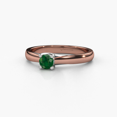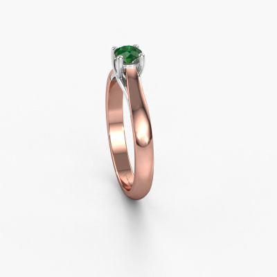 The ring shown above is called the Mia 1. We call this a solitaire ring because it contains a single gemstone. The engagement ring is made in 14 Carat rose gold and has a round emerald of 4 mm. This extraordinary modern rose gold solitaire engagement ring is set with a beautiful round emerald to add sparkle to your proposal. The open prong setting allows light to strike the gemstone from various angles. Did you know a diamond represents everlasting love and fidelity? This makes it a perfect centrepiece. Our goldsmith carefully positions the gemstone of your choosing high on top of the ring, which makes it stand out. Each piece of jewellery is made just for you by our master goldsmiths in our own studio.By using our modern techniques, we can design and customize the finest quality jewels with the utmost care for you. Our engagement rings are always priced 30 percent lower than other jewellers. We make engagement rings to order so we don't have to maintain a large stock. If you have a certain budget, we are more than happy to advice you accordingly.Our designers and goldsmiths work together each day, creating new jewels. Perhaps you have found a nice modern engagement ring somewhere, which can be used to customize your unique ring. Please feel free to contact us. We will make you an offer, based on a fair price/ quality ratio, which will amaze you.To make it easier for you, we offer a 30 day return policy. Check our terms and conditions.