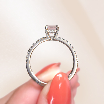 The ring shown above is called the Saskia eme 1, we call this a solitaire ring because it contains a single gemstone. The engagement ring is made in platinum and has a emerald cut morganite champagne of 7x5 mm. The cool thing about our configurator is that you can compile your own piece of jewellery, into a completely personalized one. This solitaire ring is crafted in the precious metals platinum with platinum, but of course you are free to pick your own colours. Each piece of jewellery is made with passion and love by one of our master goldsmiths.The solitaire ring is a special type of engagement ring. Its open prong setting allows light to strike the gemstone from various angles. This exclusive engagement ring is a stunning eye-catcher because of the high positioning of the gemstone. In order for you to commemorate your proposal with a unique ring, we carefully adorn this solitaire ring by hand. The love of your life deserves nothing but the best. After receiving your order, our goldsmiths will passionately start the creative process of making your engagement ring in our own studio. Because we don't have a big stockpile, these costs will not be passed on to you. Our pricing is proof of that! We offer top quality jewels at lowest price, guaranteed.Our team adds new designs to our online collection daily. Our designers and goldsmiths work together in creating the best design. We strive to offer a diverse collection of jewels. Perhaps you have a specific jewel design in mind. One you came across somewhere. Please contact us for a free consultation. We will make you an offer, based on a fair price/ quality ratio, that will baffle you.To make it easier for you, we offer a 30 day return policy. Check our terms and conditions.