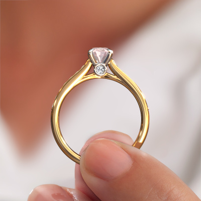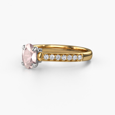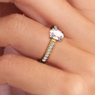 The ring shown above is called the Valorie ovl 2. We call this type of ring a pavé solitaire ring because it has one centre gemstone and a band that is also pave set with gemstones. This engagement ring is made in 14 Carat gold set with a 7x5 mm oval morganite champagne, and pave set lab-grown diamonds at the sides. Each piece of jewellery is made with passion and love by one of our master goldsmiths.This fashionable gold pavé solitaire engagement ring has an exquisite oval morganite champagne centre stone. To further accentuate the centre stone, the band is set full with more lab-grown diamonds. Its open prong setting allows light to strike the morganite champagne from various angles and this adds sparkle to your morganite champagne ring. The photo shown above depicts the goldsmith's carefully handcrafted details of the ring. The high positioning of the centre stone is truly eye-catching. The perfect engagement ring for the crown jewel of your life!Are you on a budget? Please feel free to contact us, so we can go discuss your options. We offer our engagement rings at guaranteed best price, because we make them to order. You won't find such a price anywhere else!Our team adds new designs to our online collection daily. Our designers and goldsmiths work together in creating the best design. We strive to offer a diverse collection of jewels. Perhaps you have a specific jewel design in mind. One you came across somewhere. Please contact us for a free consultation. We will make you an offer, based on a fair price/ quality ratio, that will baffle you.To make it easier for you, we offer a 30 day return policy. Check our terms and conditions.