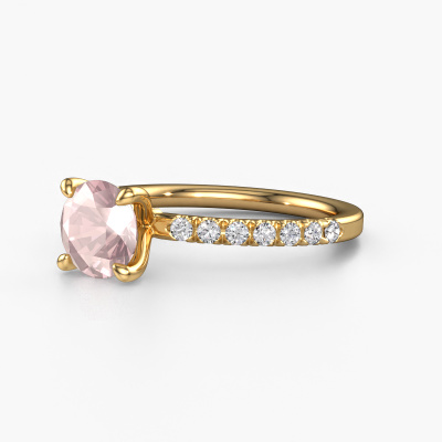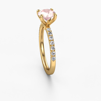 The ring shown above is called the Crystal RND 2. We call this type of ring a pavé solitaire ring because it has one centre gemstone and a band that is also pave set with gemstones. The 14 Carat gold engagement ring is set with a round 7 mm morganite champagne centre stone and the band is pave set with lab grown diamond gemstones. Each jewel is unique in every way! Simply customize to your liking,This classic gold pavé solitaire engagement ring has an exquisite round morganite champagne centre stone. To further accentuate the centre stone, the band is fully set with more lab-grown diamonds. Its open prong setting allows light to strike the morganite champagne from various angles and this adds sparkle to your morganite champagne ring. The photo shown above depicts the goldsmith's carefully handcrafted details of the ring. The high positioning of the centre stone is truly eye-catching. The perfect engagement ring for the crown jewel of your life! After receiving your order, our goldsmiths will start the creative process of making your Crystal RND 2 engagement ring. We don't keep stock. This is advantageous because these costs will not be passed on to you. Therefore, we can offer jewellery at exceptionally low prices.Different styles of new rings are made daily by our team. Perhaps you have found a pavé solitaire engagement ring somewhere. One you would like to give to your loved one. Please feel free to share your thoughts and design with our jewel designers. We would love to turn your design into a classic engagement ring. You can follow the development of your ring design because we use very detailed 3D drawings. On top of that, you can order a dummy of the design. A dummy is a plastic ring, which can be shaped according your ring design. You can try it on and check if the engagement ring is up to standard. We will gladly send you a non-binding offer, based on a fair price/ quality ratio. The offer will baffle you, considering the quality of the ring and gemstones.To make it easier for you, we offer a 30 day return policy. Check our terms and conditions.