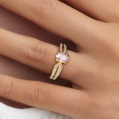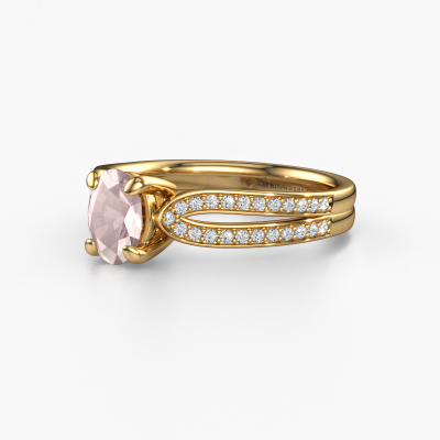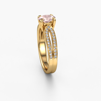 The ring shown above is called the Antonia ovl 2. We call this type of ring a pavé solitaire ring because it has one centre gemstone and a band that is also pave set with gemstones. The 14 Carat gold engagement ring is set with a oval 7x5 mm morganite champagne centre stone and the band is pave set with diamond gemstones. Each jewel is unique in every way! Simply customize to your liking,This contemporary gold pavé solitaire engagement ring has an exquisite oval morganite champagne centre stone. To further accentuate the centre stone, the band is fully set with more diamonds. Its open prong setting allows light to strike the morganite champagne from various angles and this adds sparkle to your morganite champagne ring. The photo shown above depicts the goldsmith's carefully handcrafted details of the ring. The high positioning of the centre stone is truly eye-catching. The perfect engagement ring for the crown jewel of your life! By using a combination of the latest modern techniques, combined with ancient crafting, we can make all our engagement rings in our own studio. Each jewel is made to order. This is advantageous because we can offer you a price you won't find anywhere else.Our team adds new designs to our online collection daily. Our designers and goldsmiths work together in creating the best design. We strive to offer a diverse collection of jewels. Perhaps you have a specific jewel design in mind. One you came across somewhere. Please contact us for a free consultation. We will make you an offer, based on a fair price/ quality ratio, that will baffle you.To make it easier for you, we offer a 30 day return policy. Check our terms and conditions.