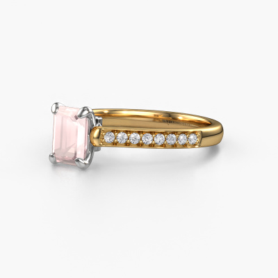 The ring shown above is called the Valorie eme 2. We call this type of ring a pavé solitaire ring because it has one centre gemstone and a band that is also pave set with gemstones. The 14 Carat gold engagement ring is set with a emerald cut 6.5x4.5 mm morganite champagne centre stone and the band is pave set with diamond gemstones. Each jewel is made by a team of passionate goldsmiths and jewel designers. This will make your crown jewel truly eye-catching.This classic gold pavé solitaire engagement ring has an exquisite emerald cut morganite champagne centre stone. To further accentuate the centre stone, the band is fully set with more diamonds. Its open prong setting allows light to strike the morganite champagne from various angles and this adds sparkle to your morganite champagne ring. The photo shown above depicts the goldsmith's carefully handcrafted details of the ring. The high positioning of the centre stone is truly eye-catching. The perfect engagement ring for the crown jewel of your life! By using our modern techniques, we can design and customize the finest quality jewels with the utmost care for you. Our engagement rings are always priced 30 percent lower than other jewellers. We make engagement rings to order so we don't have to maintain a large stock. If you have a certain budget, we are more than happy to advice you accordingly.Have you found a specific engagement ring somewhere which you would like to give to your loved one? Please feel free to express your wishes to our jewel designers because we would be honoured to turn your design into a classic engagement ring. You can follow the development of your ring design because we use 3D drawings. This gives you a realistic preview of how your design will look. You can also preorder a dummy. A dummy is a plastic ring, which can be shaped according your ring design. You can try it on and check if its width and size are suitable for you. We will gladly send you a non-binding offer, based on a fair price/ quality ratio. It will amaze you, considering the quality of the ring and gemstones.To make it easier for you, we offer a 30 day return policy. Check our terms and conditions.