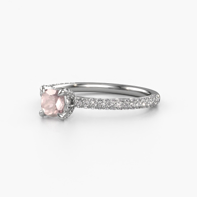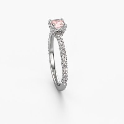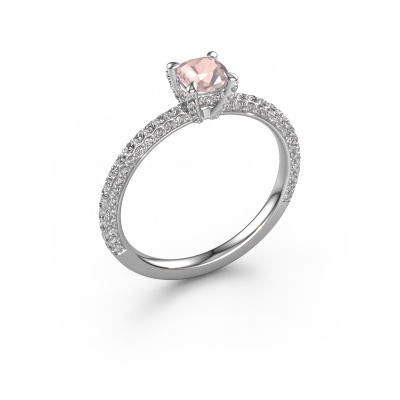 The ring shown above is called the Saskia 2 cus. We call this type of ring a pavé solitaire ring because it has one centre gemstone and a band that is also pave set with gemstones. The platinum engagement ring is set with a cushion 4.5 mm morganite champagne centre stone and the band is pave set with lab grown diamond gemstones. Each jewel is made just for you, with attention to detail and design.This contemporary platinum pavé solitaire engagement ring has an exquisite cushion morganite champagne centre stone. To further accentuate the centre stone, the band is fully set with more lab-grown diamonds. Its open prong setting allows light to strike the morganite champagne from various angles and this adds sparkle to your morganite champagne ring. The photo shown above depicts the goldsmith's carefully handcrafted details of the ring. The high positioning of the centre stone is truly eye-catching. The perfect engagement ring for the crown jewel of your life! Are you on a budget? Please feel free to contact us, so we can go discuss your options. We offer our engagement rings at guaranteed best price, because we make them to order. You won't find such a price anywhere else!Our designers and goldsmiths work together each day, creating new jewels. Perhaps you have found a nice contemporary engagement ring somewhere, which can be used to customize your unique ring. Please feel free to contact us. We will make you an offer, based on a fair price/ quality ratio, which will amaze you.To make it easier for you, we offer a 30 day return policy. Check our terms and conditions.