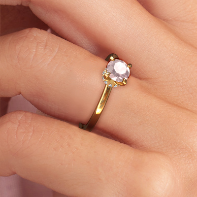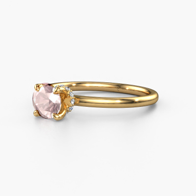 The ring shown above is called the Crystal RND 3, we call this a solitaire ring because it contains a single gemstone. The engagement ring is made in 14 Carat gold and has a round morganite champagne of 5.5 mm. The cool thing about our configurator is that you can compile your own piece of jewellery, into a completely personalized one. This solitaire ring is crafted in the precious metals gold with gold, but of course you are free to pick your own colours. Each piece of jewellery is made with passion and love by one of our master goldsmiths.The solitaire ring is a special type of engagement ring. Its open prong setting allows light to strike the gemstone from various angles. This classic engagement ring is a stunning eye-catcher because of the high positioning of the gemstone. In order for you to commemorate your proposal with a unique ring, we carefully adorn this solitaire ring by hand. The love of your life deserves nothing but the best. By using a combination of the latest modern techniques, combined with ancient crafting, we can make all our engagement rings in our own studio. Each jewel is made to order. This is advantageous because we can offer you a price you won't find anywhere else.Different styles of new rings are made daily by our team. Perhaps you have found a solitaire engagement ring somewhere. One you would like to give to your loved one. Please feel free to share your thoughts and design with our jewel designers. We would love to turn your design into a classic engagement ring. You can follow the development of your ring design because we use very detailed 3D drawings. On top of that, you can order a dummy of the design. A dummy is a plastic ring, which can be shaped according your ring design. You can try it on and check if the engagement ring is up to standard. We will gladly send you a non-binding offer, based on a fair price/ quality ratio. The offer will baffle you, considering the quality of the ring and gemstones.To make it easier for you, we offer a 30 day return policy. Check our terms and conditions.