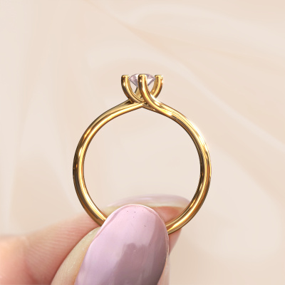 In your eyes, no one else compares to her. She is one in a million, unlike anyone else and pure? These qualities are emphasized perfectly by our modern gold solitaire morganite champagne ring. This morganite champagne is carefully selected by our keen artisan goldsmiths. It equals the unique qualities of the love of your life. There is no better way to memorialize your proposal than this symbol of true love. The ring shown above is called the Dewi Round, we call this a solitaire ring because it contains a single gemstone. The engagement ring is made in 14 Carat gold and has a round morganite champagne of 4 mm. Each piece of jewellery is made to shine bright around your finger. Each jewel is hand made with love by our goldsmiths.After receiving your order, our goldsmiths will passionately start the creative process of making your engagement ring in our own studio. Because we don't have a big stockpile, these costs will not be passed on to you. Our pricing is proof of that! We offer top quality jewels at lowest price, guaranteed.Different styles of new rings are made daily by our team. Perhaps you have found a solitaire engagement ring somewhere. One you would like to give to your loved one. Please feel free to share your thoughts and design with our jewel designers. We would love to turn your design into a modern engagement ring. You can follow the development of your ring design because we use very detailed 3D drawings. On top of that, you can order a dummy of the design. A dummy is a plastic ring, which can be shaped according your ring design. You can try it on and check if the engagement ring is up to standard. We will gladly send you a non-binding offer, based on a fair price/ quality ratio. The offer will baffle you, considering the quality of the ring and gemstones.To make it easier for you, we offer a 30 day return policy. Check our terms and conditions.