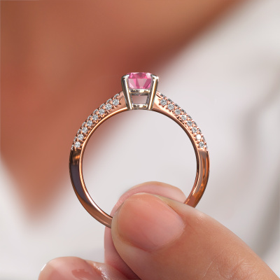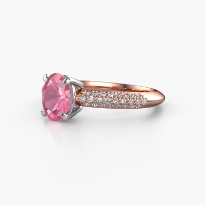 The ring shown above is called Morane OVL. We call this a pave ring. The smaller gemstones of pave ring are set in a close row which gives it an extra shine. This 14 Carat rose gold ring is set with pink sapphire 7,5x5,5 mm. The ring shown above is called Morane OVL. We call this a pave ring. The smaller gemstones of pave ring are set in a close row which gives it an extra shine. Which emotion would you like to convey when you get down on one knee for her? This rose gold engagement ring is pave set with stunning pink sapphire to represent your everlasting love. The gemstones are carefully hand selected and set by our goldsmith. The unique reflection of light on the ring can only be captured if the pink sapphire are set in a perfect line. During the crafting and polishing of the jewellery, light fall is constantly monitored, until the expert goldsmith is satisfied with the result. A ring designed just for you to make your loved one shine bright like a diamond. Because there is only one special person fit to wear such a unique ring! With this meaningful piece of art, the symbol of infinity, you will prove your undying love for her and that you want to share the rest of your life with no one else. How will she be able to resist? This piece of jewellery is created to add sparkle to your finger, each jewel is lovingly made by hand by our goldsmiths.By using our modern techniques, we can design and customize the finest quality jewels with the utmost care for you. Our engagement rings are always priced 30 percent lower than other jewellers. We make engagement rings to order so we don't have to maintain a large stock. If you have a certain budget, we are more than happy to advice you accordingly.Our designers and goldsmiths work together each day, creating new jewels. Perhaps you have found a nice modern engagement ring somewhere, which can be used to customize your unique ring. Please feel free to contact us. We will make you an offer, based on a fair price/ quality ratio, which will amaze you.To make it easier for you, we offer a 30 day return policy. Check our terms and conditions.