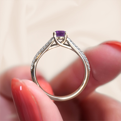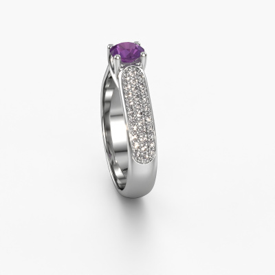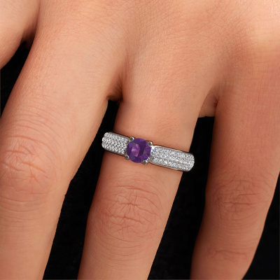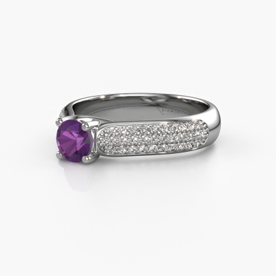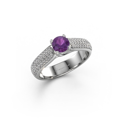 The ring shown above is called the Leoness. We call this type of ring a pavé solitaire ring. The centre gemstone is surrounded by smaller sized stones. This 14 Carat white gold version is set with a 5 mm round amethyst centre stone, embraced by smaller diamonds. What makes this classic white gold pavé solitaire ring special is the setting of the smaller gems surrounding the centre amethyst, which are shaped like a beautiful flower. The surrounding pavé solitaire of stones frame the middle centre stone in such a way to make it appear bigger. This type of engagement ring is also called a flower ring. It is very important that the smaller diamonds are positioned identically so there is no interference of light but perfect unity instead. Our skilled Goldsmiths get the job done. Each individual stone is carefully set by hand. During manufacturing, light fall is constantly monitored to make sure the special pavé solitaire effect is still visible. In the end you get the perfect engagement ring with a radiant amethyst gemstone centrepiece. You can imagine the effect of a ring of such significance when you give tot the love of your life on her special day to shine. This jewel is unique in every way! Simply customize to your liking,By using our modern techniques, we can design and customize the finest quality jewels with the utmost care for you. Our engagement rings are always priced 30 percent lower than other jewellers. We make engagement rings to order so we don't have to maintain a large stock. If you have a certain budget, we are more than happy to advice you accordingly.Have you found a specific engagement ring somewhere which you would like to give to your loved one? Please feel free to express your wishes to our jewel designers because we would be honoured to turn your design into a classic engagement ring. You can follow the development of your ring design because we use 3D drawings. This gives you a realistic preview of how your design will look. You can also preorder a dummy. A dummy is a plastic ring, which can be shaped according your ring design. You can try it on and check if its width and size are suitable for you. We will gladly send you a non-binding offer, based on a fair price/ quality ratio. It will amaze you, considering the quality of the ring and gemstones.To make it easier for you, we offer a 30 day return policy. Check our terms and conditions.