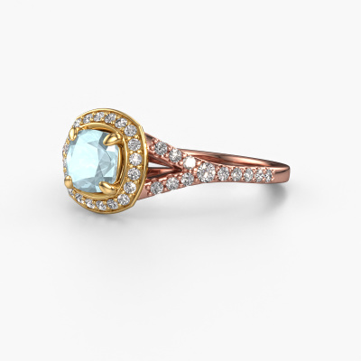 The ring shown above is called the Pamela CUS. We call this type of ring a halo ring because it has one centre gemstone and a band that is also pave set with gemstones. The 14 Carat rose gold engagement ring is set with a cushion 5.5 mm aquamarine centre stone and the band is pave set with lab-grown diamonds. What makes this luxury rose gold pavé solitaire ring special are the smaller sized stones embracing the centre stone. This gorgeous engagement ring is called a pavé solitaire ring because the smaller gemstones give the centre stone a pavé solitaire of surrounding light. In order for the smaller stones to enhance the centre stone, they have to be placed so there is no interference of light. And that's when our expert goldsmiths come in. Each individual stone is carefully set in the ring by hand. During manufacturing, light fall is constantly monitored to make sure the special pavé solitaire is still visible. In the end you get a unique engagement ring, with a aquamarine of your choosing at its centre. You can imagine the effect of a ring of such significance when you give it to her on her special day to shine. After receiving your order, our goldsmiths will passionately start the creative process of making your engagement ring in our own studio. Because we don't have a big stockpile, these costs will not be passed on to you. Our pricing is proof of that! We offer top quality jewels at lowest price, guaranteed.Different styles of new rings are made daily by our team. Perhaps you have found a pavé solitaire engagement ring somewhere. One you would like to give to your loved one. Please feel free to share your thoughts and design with our jewel designers. We would love to turn your design into a luxury engagement ring. You can follow the development of your ring design because we use very detailed 3D drawings. On top of that, you can order a dummy of the design. A dummy is a plastic ring, which can be shaped according your ring design. You can try it on and check if the engagement ring is up to standard. We will gladly send you a non-binding offer, based on a fair price/ quality ratio. The offer will baffle you, considering the quality of the ring and gemstones.To make it easier for you, we offer a 30 day return policy. Check our terms and conditions.