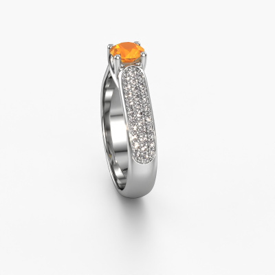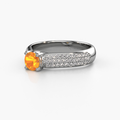 The ring shown above is called the Leoness. We call this type of ring a pavé solitaire ring. The centre gemstone is surrounded by smaller sized stones. This platinum version is set with a 5 mm round citrin centre stone, embraced by smaller diamonds. What makes this classic platinum pavé solitaire ring special is the setting of the smaller gems surrounding the centre citrin, which are shaped like a beautiful flower. The surrounding pavé solitaire of stones frame the middle centre stone in such a way to make it appear bigger. This type of engagement ring is also called a flower ring. It is very important that the smaller diamonds are positioned identically so there is no interference of light but perfect unity instead. Our skilled Goldsmiths get the job done. Each individual stone is carefully set by hand. During manufacturing, light fall is constantly monitored to make sure the special pavé solitaire effect is still visible. In the end you get the perfect engagement ring with a radiant citrin gemstone centrepiece. You can imagine the effect of a ring of such significance when you give tot the love of your life on her special day to shine. This jewel is unique in every way! Simply customize to your liking,By using our modern techniques, we can design and customize the finest quality jewels with the utmost care for you. Our engagement rings are always priced 30 percent lower than other jewellers. We make engagement rings to order so we don't have to maintain a large stock. If you have a certain budget, we are more than happy to advice you accordingly.Have you found a specific engagement ring somewhere which you would like to give to your loved one? Please feel free to express your wishes to our jewel designers because we would be honoured to turn your design into a classic engagement ring. You can follow the development of your ring design because we use 3D drawings. This gives you a realistic preview of how your design will look. You can also preorder a dummy. A dummy is a plastic ring, which can be shaped according your ring design. You can try it on and check if its width and size are suitable for you. We will gladly send you a non-binding offer, based on a fair price/ quality ratio. It will amaze you, considering the quality of the ring and gemstones.To make it easier for you, we offer a 30 day return policy. Check our terms and conditions.