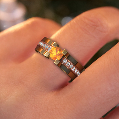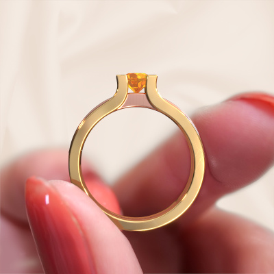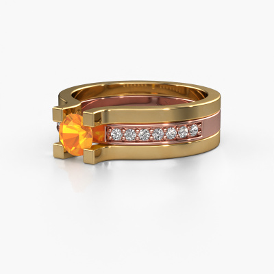 This 14 Carat rose gold ring is called Myrthe and is set with 5 mm citrin. This exclusive rose gold pavé solitaire engagement ring is a true work of art! The ornaments are crafted with a lot of patience and great passion. In order to create this ring with great precision, this craft requires a keen eye and skilful hand. A challenge which ignites a fire in our expert goldsmith. The exquisite citrin are set in a special way so they stand out even more. This gives the ring an even more glamorous appearance. The graceful engagement ring is actually unique on its own because of the gemstones which we carefully select especially for this ring. On top of that you select the precious metals which will be used to create a unique ring for the most extraordinary woman in your life! This jewel is made just for you, with attention to detail and design.After receiving your order, our goldsmiths will start the creative process of making your Myrthe engagement ring. We don't keep stock. This is advantageous because these costs will not be passed on to you. Therefore, we can offer jewellery at exceptionally low prices.Our designers and goldsmiths work together each day, creating new jewels. Perhaps you have found a nice modern engagement ring somewhere, which can be used to customize your unique ring. Please feel free to contact us. We will make you an offer, based on a fair price/ quality ratio, which will amaze you.To make it easier for you, we offer a 30 day return policy. Check our terms and conditions.