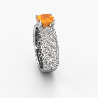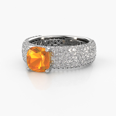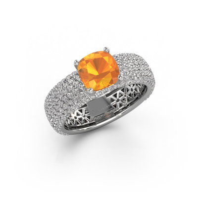 This 14 Carat white gold ring is called Darcy and is set with 7 mm citrin. This exclusive white gold pavé solitaire Engagement ring is a true work of art! The ornaments are crafted with a lot of patience and great passion. In order to create this ring with great precision, this craft requires a keen eye and skilful hand. A challenge which ignites a fire in our expert goldsmith. The exquisite citrin are set in a special way so they stand out even more. This gives the ring an even more glamorous appearance. The pavé Engagement ring is actually unique on its own because of the gemstones which we carefully select especially for this ring. On top of that you select the precious metals which will be used to create a unique ring for the most extraordinary woman in your life! This jewel is unique in every way! Simply customize to your likingBecause we design and deliver our own rings, we can offer you a Engagement ring at a price you won't find anywhere else. A ring is made to order, which helps prevent excess supplies, so we can make you a great price offer. We understand it feels risky, buying your Engagement ring online, but we will gladly assist in the designing process, taking your budget into consideration.Different styles of new rings are made daily by our team. Perhaps you have found a pavé solitaire Engagement ring somewhere. One you would like to give to your loved one. Please feel free to share your thoughts and design with our jewel designers. We would love to turn your design into a exclusive Engagement ring. You can follow the development of your ring design because we use very detailed 3D drawings. On top of that, you can order a dummy of the design. A dummy is a plastic ring, which can be shaped according your ring design. You can try it on and check if the Engagement ring is up to standard. We will gladly send you a non-binding offer, based on a fair price/ quality ratio. The offer will baffle you, considering the quality of the ring and gemstones.To make it easier for you, we offer a 30 day return policy. Check our terms and conditions.