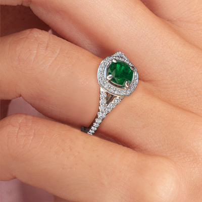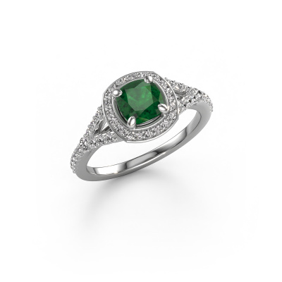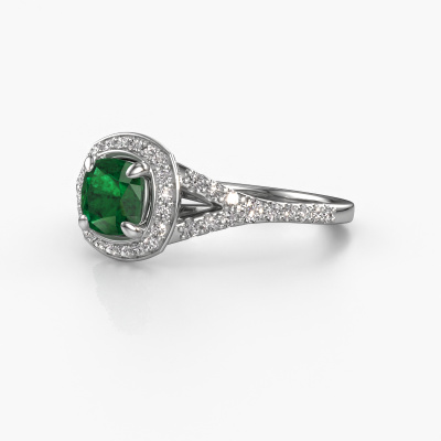 The ring shown above is called the Pamela CUS. We call this type of ring a halo ring because it has one centre gemstone and a band that is also pave set with gemstones. The platinum engagement ring is set with a cushion 5.5 mm emerald centre stone and the band is pave set with lab-grown diamonds. What makes this luxury platinum pavé solitaire ring special are the smaller sized stones embracing the centre stone. This gorgeous engagement ring is called a pavé solitaire ring because the smaller gemstones give the centre stone a pavé solitaire of surrounding light. In order for the smaller stones to enhance the centre stone, they have to be placed so there is no interference of light. And that's when our expert goldsmiths come in. Each individual stone is carefully set in the ring by hand. During manufacturing, light fall is constantly monitored to make sure the special pavé solitaire is still visible. In the end you get a unique engagement ring, with a emerald of your choosing at its centre. You can imagine the effect of a ring of such significance when you give it to her on her special day to shine. After receiving your order, our goldsmiths will passionately start the creative process of making your engagement ring in our own studio. Because we don't have a big stockpile, these costs will not be passed on to you. Our pricing is proof of that! We offer top quality jewels at lowest price, guaranteed.Different styles of new rings are made daily by our team. Perhaps you have found a pavé solitaire engagement ring somewhere. One you would like to give to your loved one. Please feel free to share your thoughts and design with our jewel designers. We would love to turn your design into a luxury engagement ring. You can follow the development of your ring design because we use very detailed 3D drawings. On top of that, you can order a dummy of the design. A dummy is a plastic ring, which can be shaped according your ring design. You can try it on and check if the engagement ring is up to standard. We will gladly send you a non-binding offer, based on a fair price/ quality ratio. The offer will baffle you, considering the quality of the ring and gemstones.To make it easier for you, we offer a 30 day return policy. Check our terms and conditions.