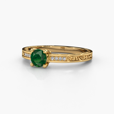 This 14 Carat gold ring is called Claudette 2 and is set with 5 mm emerald. Is your girlfriend hooked on vintage? Then this gold filigree engagement ring will surely match her style perfectly. A trendy ring with just a hint of Celtic adornment. A truly stunning, romantic design! Especially when you customize your ring to your own liking. This Celtic pavé solitaire engagement ring is set with stunning emerald. As you can see, you are the boss in selecting a gemstone which matches the style of your girlfriend best. Each gemstone is carefully selected by our merchants whom are spread throughout the world. Nothing but the best gems for our expert goldsmith. After all, it is his crowning glory! Each jewel is made just for you by our master goldsmiths in our own studio.After receiving your order, our goldsmiths will start the creative process of making your Claudette 2 engagement ring. We don't keep stock. This is advantageous because these costs will not be passed on to you. Therefore, we can offer jewellery at exceptionally low prices.Do you have a specific ring in mind? One you came across somewhere. Please feel free to tell us your wishes and we will turn your design into a unique engagement ring. You can follow the development of your ring design because we use 3D drawings. This gives you a realistic preview of your design. We will gladly send you a non-binding offer, based on a fair price/ quality ratio. It will amaze you.To make it easier for you, we offer a 30 day return policy. Check our terms and conditions.