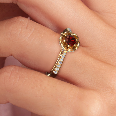 This 14 Carat gold ring is called Abbey and is set with 4.2 mm garnet. Is your girlfriend hooked on vintage? Then this gold pearl edges engagement ring will surely match her style perfectly. A trendy ring with just a hint of vintage adornment. A truly stunning, romantic design! Especially when you customize your ring to your own liking. This vintage pavé solitaire engagement ring is set with stunning garnet. As you can see, you are the boss in selecting a gemstone which matches the style of your girlfriend best. Each gemstone is carefully selected by our merchants whom are spread throughout the world. Nothing but the best gems for our expert goldsmith. After all, it is his crowning glory! Each jewel is made just for you, with attention to detail and design.By using our modern techniques, we can design and customize the finest quality jewels with the utmost care for you. Our engagement rings are always priced 30 percent lower than other jewellers. We make engagement rings to order so we don't have to maintain a large stock. If you have a certain budget, we are more than happy to advice you accordingly.Our designers and goldsmiths work together each day, creating new jewels. Perhaps you have found a nice vintage engagement ring somewhere, which can be used to customize your unique ring. Please feel free to contact us. We will make you an offer, based on a fair price/ quality ratio, which will amaze you.To make it easier for you, we offer a 30 day return policy. Check our terms and conditions.