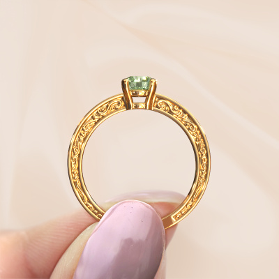 This 14 Carat gold ring is called Claudette 2 and is set with 5 mm green lab grown diamond. Is your girlfriend hooked on vintage? Then this gold filigree engagement ring will surely match her style perfectly. A trendy ring with just a hint of Celtic adornment. A truly stunning, romantic design! Especially when you customize your ring to your own liking. This Celtic pavé solitaire engagement ring is set with stunning green lab grown diamonds. As you can see, you are the boss in selecting a gemstone which matches the style of your girlfriend best. Each gemstone is carefully selected by our merchants whom are spread throughout the world. Nothing but the best gems for our expert goldsmith. After all, it is his crowning glory! Each jewel is made just for you by our master goldsmiths in our own studio.After receiving your order, our goldsmiths will start the creative process of making your Claudette 2 engagement ring. We don't keep stock. This is advantageous because these costs will not be passed on to you. Therefore, we can offer jewellery at exceptionally low prices.Do you have a specific ring in mind? One you came across somewhere. Please feel free to tell us your wishes and we will turn your design into a unique engagement ring. You can follow the development of your ring design because we use 3D drawings. This gives you a realistic preview of your design. We will gladly send you a non-binding offer, based on a fair price/ quality ratio. It will amaze you.To make it easier for you, we offer a 30 day return policy. Check our terms and conditions.