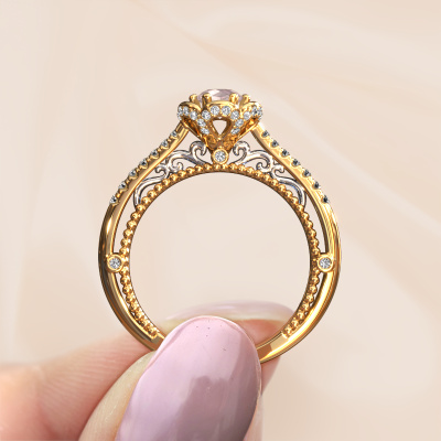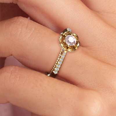 This 14 Carat gold ring is called Abbey and is set with 4.2 mm morganite champagne. Is your girlfriend hooked on vintage? Then this gold pearl edges engagement ring will surely match her style perfectly. A trendy ring with just a hint of vintage adornment. A truly stunning, romantic design! Especially when you customize your ring to your own liking. This vintage pavé solitaire engagement ring is set with stunning morganite champagne. As you can see, you are the boss in selecting a gemstone which matches the style of your girlfriend best. Each gemstone is carefully selected by our merchants whom are spread throughout the world. Nothing but the best gems for our expert goldsmith. After all, it is his crowning glory! Each jewel is made just for you, with attention to detail and design.By using our modern techniques, we can design and customize the finest quality jewels with the utmost care for you. Our engagement rings are always priced 30 percent lower than other jewellers. We make engagement rings to order so we don't have to maintain a large stock. If you have a certain budget, we are more than happy to advice you accordingly.Our designers and goldsmiths work together each day, creating new jewels. Perhaps you have found a nice vintage engagement ring somewhere, which can be used to customize your unique ring. Please feel free to contact us. We will make you an offer, based on a fair price/ quality ratio, which will amaze you.To make it easier for you, we offer a 30 day return policy. Check our terms and conditions.