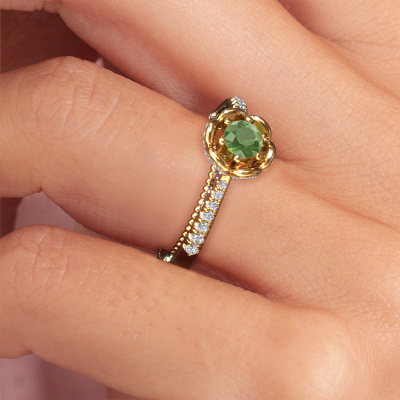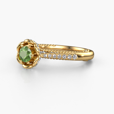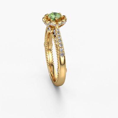 This 14 Carat gold ring is called Abbey and is set with 4.2 mm tourmaline green. Is your girlfriend hooked on vintage? Then this gold pearl edges engagement ring will surely match her style perfectly. A trendy ring with just a hint of vintage adornment. A truly stunning, romantic design! Especially when you customize your ring to your own liking. This vintage pavé solitaire engagement ring is set with stunning tourmaline green. As you can see, you are the boss in selecting a gemstone which matches the style of your girlfriend best. Each gemstone is carefully selected by our merchants whom are spread throughout the world. Nothing but the best gems for our expert goldsmith. After all, it is his crowning glory! Each jewel is made just for you, with attention to detail and design.By using our modern techniques, we can design and customize the finest quality jewels with the utmost care for you. Our engagement rings are always priced 30 percent lower than other jewellers. We make engagement rings to order so we don't have to maintain a large stock. If you have a certain budget, we are more than happy to advice you accordingly.Our designers and goldsmiths work together each day, creating new jewels. Perhaps you have found a nice vintage engagement ring somewhere, which can be used to customize your unique ring. Please feel free to contact us. We will make you an offer, based on a fair price/ quality ratio, which will amaze you.To make it easier for you, we offer a 30 day return policy. Check our terms and conditions.