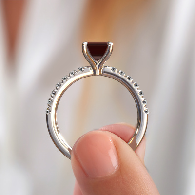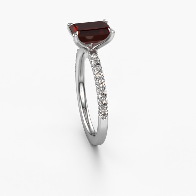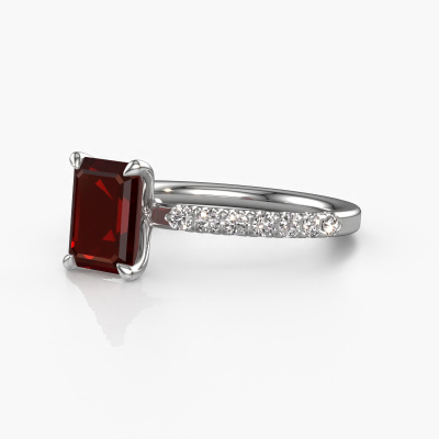 The ring shown above is called the Crystal EME 2, we call this a solitaire ring because it contains a single gemstone. The engagement ring is made in platinum and has a emerald cut garnet of 8x6 mm. This exclusive platinum solitaire ring with exquisite emerald cut garnet is a beautiful engagement ring. The open prong setting allows light to strike the gemstone from various angles. The ring also stands out because of the high positioning of the gemstone. Because diamonds symbolize true love and purity, they make the perfect gift for the love of your life. The symbol of eternal love is the centerpiece of this solitaire ring. Like a diamond, all other types of precious metal have their own attributed symbolic meaning. You can compile the pavé solitaire engagement ring yourself in various precious metal combinations. This one has the combination of platinum with platinum. Each piece of jewelry is made just for you by our master goldsmiths in our own studio.By using a combination of the latest modern techniques, combined with ancient crafting, we can make all our engagement rings in our own studio. Each jewel is made to order. This is advantageous because we can offer you a price you won't find anywhere else.Our team adds new designs to our online collection daily. Our designers and goldsmiths work together in creating the best design. We strive to offer a diverse collection of jewels. Perhaps you have a specific jewel design in mind. One you came across somewhere. Please contact us for a free consultation. We will make you an offer, based on a fair price/ quality ratio, that will baffle you.To make it easier for you, we offer a 30 day return policy. Check our terms and conditions.