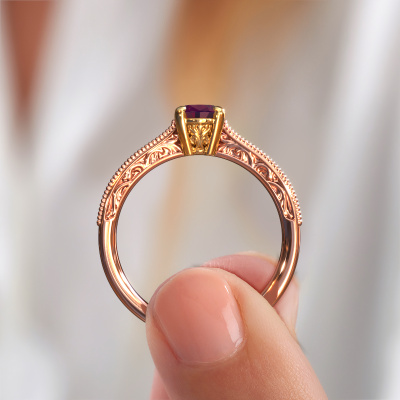 This 14 Carat rose gold ring is called Shonta OVL and is set with 7x5 mm rhodolite. Is your girlfriend hooked on vintage? Then this rose gold pearl designs engagement ring will surely match her style perfectly. A trendy ring with just a hint of fantasy adornment. A truly stunning, romantic design! Especially when you customize your ring to your own liking. This fantasy pavé solitaire engagement ring is set with stunning rhodolite. As you can see, you are the boss in selecting a gemstone which matches the style of your girlfriend best. Each gemstone is carefully selected by our merchants whom are spread throughout the world. Nothing but the best gems for our expert goldsmith. After all, it is his crowning glory! Each jewel is unique in every way! Simply customize to your liking,By using a combination of the latest modern techniques, combined with ancient crafting, we can make all our engagement rings in our own studio. Each jewel is made to order. This is advantageous because we can offer you a price you won't find anywhere else.Our team adds new designs to our online collection daily. Our designers and goldsmiths work together in creating the best design. We strive to offer a diverse collection of jewels. Perhaps you have a specific jewel design in mind. One you came across somewhere. Please contact us for a free consultation. We will make you an offer, based on a fair price/ quality ratio, that will baffle you.To make it easier for you, we offer a 30 day return policy. Check our terms and conditions.