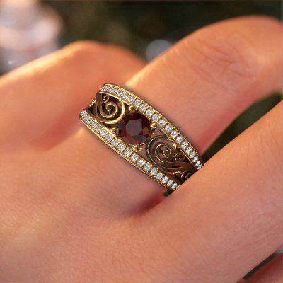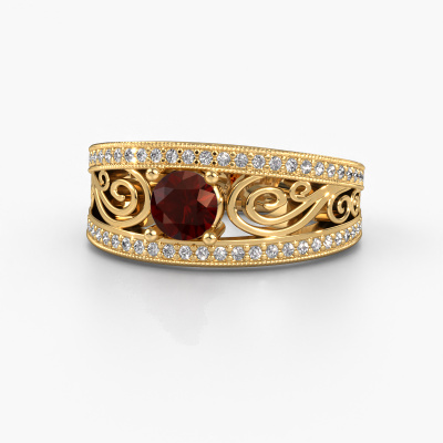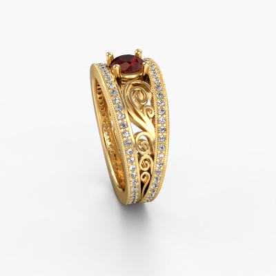 This 14 Carat gold ring is called Julliana and is set with 5 mm garnet. For you, there is only one person in your life who stands out in a crowd. Only one that makes your heart skip a beat. A true gem! She, above all others, deserves a special gift. A unique customized jewel made in her honour. We believe this ring is perfect for your special moment. Each detail of this exclusive gold pavé solitaire engagement ring is selected by hand, crafted and polished by our expert goldsmith in our own artisan studio. We strive to achieve the perfect design and composition of the ring, so it enhances the unique features of our garnet, and lets them shine even brighter. It takes a lot of precision to make but in the end it pays off because of the sheer beauty of the ring. And that is our main goal. It's what gets us excited. The great thing about our online tool is, that you can design your own jewellery into a unique, personalized piece. This unique filigree engagement ring is created with the precious metal combination of gold and gold. But of course you are completely free to select other colours. Each piece of jewellery is made just for you by our master goldsmiths in our own studio.By using our modern techniques, we can design and customize the finest quality jewels with the utmost care for you. Our engagement rings are always priced 30 percent lower than other jewellers. We make engagement rings to order so we don't have to maintain a large stock. If you have a certain budget, we are more than happy to advice you accordingly.Our team adds new designs to our online collection daily. Our designers and goldsmiths work together in creating the best design. We strive to offer a diverse collection of jewels. Perhaps you have a specific jewel design in mind. One you came across somewhere. Please contact us for a free consultation. We will make you an offer, based on a fair price/ quality ratio, that will baffle you.To make it easier for you, we offer a 30 day return policy. Check our terms and conditions.