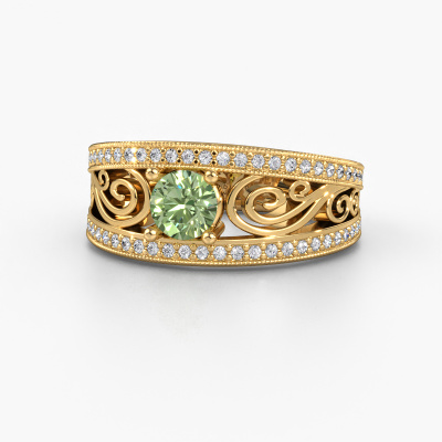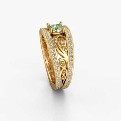 This 14 Carat gold ring is called Julliana and is set with 5 mm green lab grown diamond. For you, there is only one person in your life who stands out in a crowd. Only one that makes your heart skip a beat. A true gem! She, above all others, deserves a special gift. A unique customized jewel made in her honour. We believe this ring is perfect for your special moment. Each detail of this exclusive gold pavé solitaire engagement ring is selected by hand, crafted and polished by our expert goldsmith in our own artisan studio. We strive to achieve the perfect design and composition of the ring, so it enhances the unique features of our green lab grown diamonds, and lets them shine even brighter. It takes a lot of precision to make but in the end it pays off because of the sheer beauty of the ring. And that is our main goal. It's what gets us excited. The great thing about our online tool is, that you can design your own jewellery into a unique, personalized piece. This unique filigree engagement ring is created with the precious metal combination of gold and gold. But of course you are completely free to select other colours. Each piece of jewellery is made just for you by our master goldsmiths in our own studio.By using our modern techniques, we can design and customize the finest quality jewels with the utmost care for you. Our engagement rings are always priced 30 percent lower than other jewellers. We make engagement rings to order so we don't have to maintain a large stock. If you have a certain budget, we are more than happy to advice you accordingly.Our team adds new designs to our online collection daily. Our designers and goldsmiths work together in creating the best design. We strive to offer a diverse collection of jewels. Perhaps you have a specific jewel design in mind. One you came across somewhere. Please contact us for a free consultation. We will make you an offer, based on a fair price/ quality ratio, that will baffle you.To make it easier for you, we offer a 30 day return policy. Check our terms and conditions.