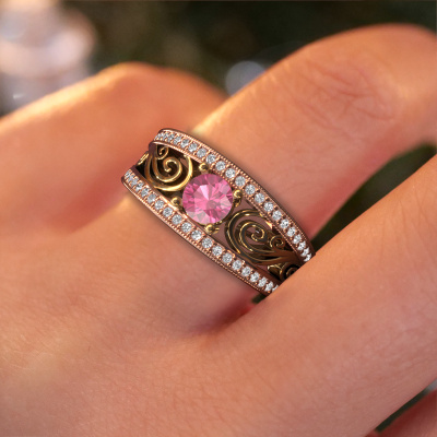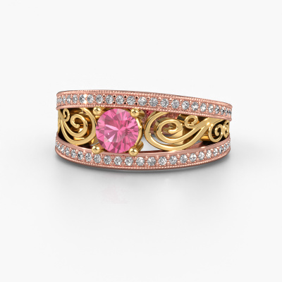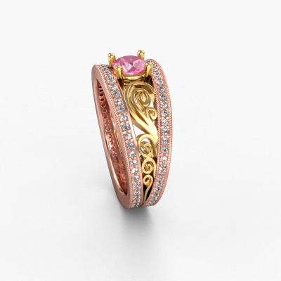 This 14 Carat rose gold ring is called Julliana and is set with 5 mm pink sapphire. For you, there is only one person in your life who stands out in a crowd. Only one that makes your heart skip a beat. A true gem! She, above all others, deserves a special gift. A unique customized jewel made in her honour. We believe this ring is perfect for your special moment. Each detail of this exclusive rose gold pavé solitaire engagement ring is selected by hand, crafted and polished by our expert goldsmith in our own artisan studio. We strive to achieve the perfect design and composition of the ring, so it enhances the unique features of our pink sapphire, and lets them shine even brighter. It takes a lot of precision to make but in the end it pays off because of the sheer beauty of the ring. And that is our main goal. It's what gets us excited. The great thing about our online tool is, that you can design your own jewellery into a unique, personalized piece. This unique filigree engagement ring is created with the precious metal combination of rose gold and gold. But of course you are completely free to select other colours. Each piece of jewellery is made just for you by our master goldsmiths in our own studio.By using our modern techniques, we can design and customize the finest quality jewels with the utmost care for you. Our engagement rings are always priced 30 percent lower than other jewellers. We make engagement rings to order so we don't have to maintain a large stock. If you have a certain budget, we are more than happy to advice you accordingly.Our team adds new designs to our online collection daily. Our designers and goldsmiths work together in creating the best design. We strive to offer a diverse collection of jewels. Perhaps you have a specific jewel design in mind. One you came across somewhere. Please contact us for a free consultation. We will make you an offer, based on a fair price/ quality ratio, that will baffle you.To make it easier for you, we offer a 30 day return policy. Check our terms and conditions.