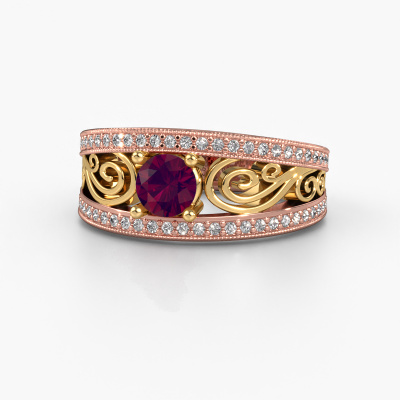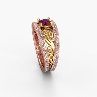 This 14 Carat rose gold ring is called Julliana and is set with 5 mm rhodolite. For you, there is only one person in your life who stands out in a crowd. Only one that makes your heart skip a beat. A true gem! She, above all others, deserves a special gift. A unique customized jewel made in her honour. We believe this ring is perfect for your special moment. Each detail of this exclusive rose gold pavé solitaire engagement ring is selected by hand, crafted and polished by our expert goldsmith in our own artisan studio. We strive to achieve the perfect design and composition of the ring, so it enhances the unique features of our rhodolite, and lets them shine even brighter. It takes a lot of precision to make but in the end it pays off because of the sheer beauty of the ring. And that is our main goal. It's what gets us excited. The great thing about our online tool is, that you can design your own jewellery into a unique, personalized piece. This unique filigree engagement ring is created with the precious metal combination of rose gold and gold. But of course you are completely free to select other colours. Each piece of jewellery is made just for you by our master goldsmiths in our own studio.By using our modern techniques, we can design and customize the finest quality jewels with the utmost care for you. Our engagement rings are always priced 30 percent lower than other jewellers. We make engagement rings to order so we don't have to maintain a large stock. If you have a certain budget, we are more than happy to advice you accordingly.Our team adds new designs to our online collection daily. Our designers and goldsmiths work together in creating the best design. We strive to offer a diverse collection of jewels. Perhaps you have a specific jewel design in mind. One you came across somewhere. Please contact us for a free consultation. We will make you an offer, based on a fair price/ quality ratio, that will baffle you.To make it easier for you, we offer a 30 day return policy. Check our terms and conditions.