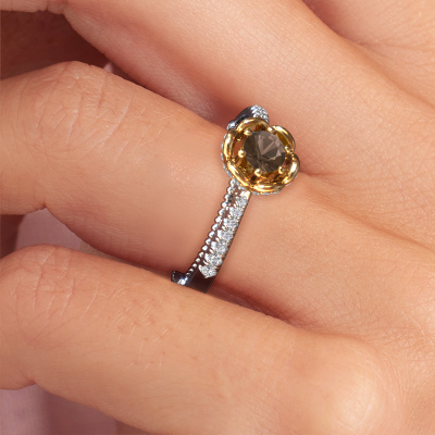 This 14 Carat white gold ring is called Abbey and is set with 4.2 mm smokey quartz. Is your girlfriend hooked on vintage? Then this white gold pearl edges engagement ring will surely match her style perfectly. A trendy ring with just a hint of vintage adornment. A truly stunning, romantic design! Especially when you customize your ring to your own liking. This vintage pavé solitaire engagement ring is set with stunning smokey quartz. As you can see, you are the boss in selecting a gemstone which matches the style of your girlfriend best. Each gemstone is carefully selected by our merchants whom are spread throughout the world. Nothing but the best gems for our expert goldsmith. After all, it is his crowning glory! Each jewel is made just for you, with attention to detail and design.By using our modern techniques, we can design and customize the finest quality jewels with the utmost care for you. Our engagement rings are always priced 30 percent lower than other jewellers. We make engagement rings to order so we don't have to maintain a large stock. If you have a certain budget, we are more than happy to advice you accordingly.Our designers and goldsmiths work together each day, creating new jewels. Perhaps you have found a nice vintage engagement ring somewhere, which can be used to customize your unique ring. Please feel free to contact us. We will make you an offer, based on a fair price/ quality ratio, which will amaze you.To make it easier for you, we offer a 30 day return policy. Check our terms and conditions.