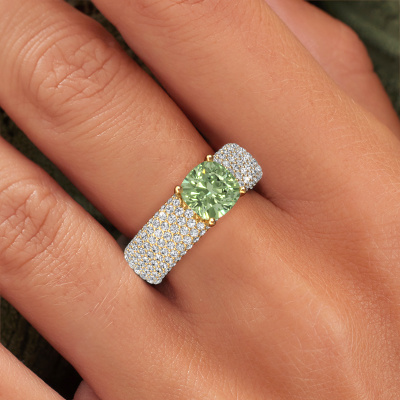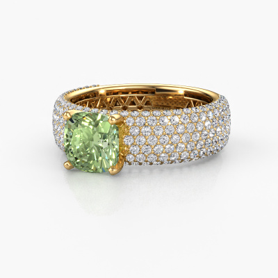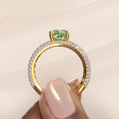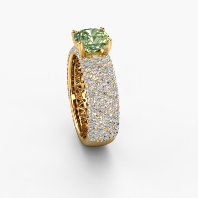 This 14 Carat gold ring is called Darcy and is set with 7 mm green lab grown diamond. This exclusive gold pavé solitaire Engagement ring is a true work of art! The ornaments are crafted with a lot of patience and great passion. In order to create this ring with great precision, this craft requires a keen eye and skilful hand. A challenge which ignites a fire in our expert goldsmith. The exquisite green lab grown diamonds are set in a special way so they stand out even more. This gives the ring an even more glamorous appearance. The pavé Engagement ring is actually unique on its own because of the gemstones which we carefully select especially for this ring. On top of that you select the precious metals which will be used to create a unique ring for the most extraordinary woman in your life! This jewel is unique in every way! Simply customize to your likingBecause we design and deliver our own rings, we can offer you a Engagement ring at a price you won't find anywhere else. A ring is made to order, which helps prevent excess supplies, so we can make you a great price offer. We understand it feels risky, buying your Engagement ring online, but we will gladly assist in the designing process, taking your budget into consideration.Different styles of new rings are made daily by our team. Perhaps you have found a pavé solitaire Engagement ring somewhere. One you would like to give to your loved one. Please feel free to share your thoughts and design with our jewel designers. We would love to turn your design into a exclusive Engagement ring. You can follow the development of your ring design because we use very detailed 3D drawings. On top of that, you can order a dummy of the design. A dummy is a plastic ring, which can be shaped according your ring design. You can try it on and check if the Engagement ring is up to standard. We will gladly send you a non-binding offer, based on a fair price/ quality ratio. The offer will baffle you, considering the quality of the ring and gemstones.To make it easier for you, we offer a 30 day return policy. Check our terms and conditions.