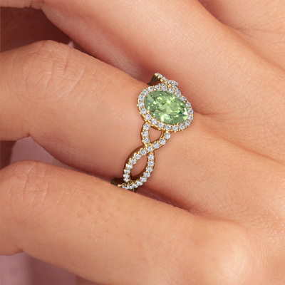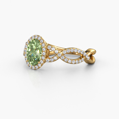 This 14 Carat gold ring is called Dionne ovl and is set with 7x5 mm green lab grown diamond. This exclusive gold pavé solitaire engagement ring is a true work of art! The ornaments are crafted with a lot of patience and great passion. In order to create this ring with great precision, this craft requires a keen eye and skilful hand. A challenge which ignites a fire in our expert goldsmith. The exquisite green lab grown diamonds are set in a special way so they stand out even more. This gives the ring an even more glamorous appearance. The twisted engagement ring is actually unique on its own because of the gemstones which we carefully select especially for this ring. On top of that you select the precious metals which will be used to create a unique ring for the most extraordinary woman in your life! This jewel is unique in every way! Simply customize to your likingAfter receiving your order, our goldsmiths will start the creative process of making your Dionne ovl engagement ring. We don't keep stock. This is advantageous because these costs will not be passed on to you. Therefore, we can offer jewellery at exceptionally low prices.Different styles of new rings are made daily by our team. Perhaps you have found a pavé solitaire engagement ring somewhere. One you would like to give to your loved one. Please feel free to share your thoughts and design with our jewel designers. We would love to turn your design into a exclusive engagement ring. You can follow the development of your ring design because we use very detailed 3D drawings. On top of that, you can order a dummy of the design. A dummy is a plastic ring, which can be shaped according your ring design. You can try it on and check if the engagement ring is up to standard. We will gladly send you a non-binding offer, based on a fair price/ quality ratio. The offer will baffle you, considering the quality of the ring and gemstones.To make it easier for you, we offer a 30 day return policy. Check our terms and conditions.